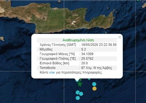 Οι σεισμικές δονήσεις στην περιοχή συνεχίζονται, με το Γεωδυναμικό Ινστιτούτο Αθηνών να καταγράφει δόνηση μεγέθους 5,2 βαθμών της κλίμακας Ρίχτερ. Ο σεισμός σημειώθηκε στις 02:22 τα ξημερώματα της Τρίτης, με επίκεντρο 97 χλμ. νότια της Αρβης. Το εστιακό βάθος του σεισμού μετρήθηκε στα 20 χιλιόμετρα, ενώ λίγο αργότερα, στις 02:39, καταγράφηκε άλλη μία δόνηση μεγέθους 4 βαθμών της κλίμακας Ρίχτερ, με επίκεντρο 115 χλμ νότια της Αρβης και εστιακό βάθος στα 10 χιλιόμετρα.