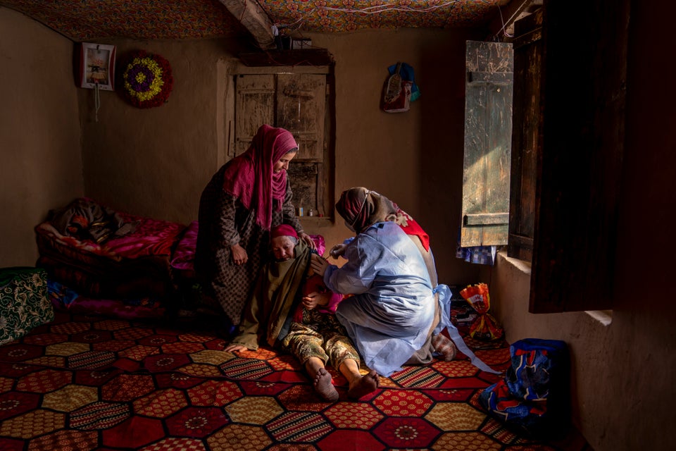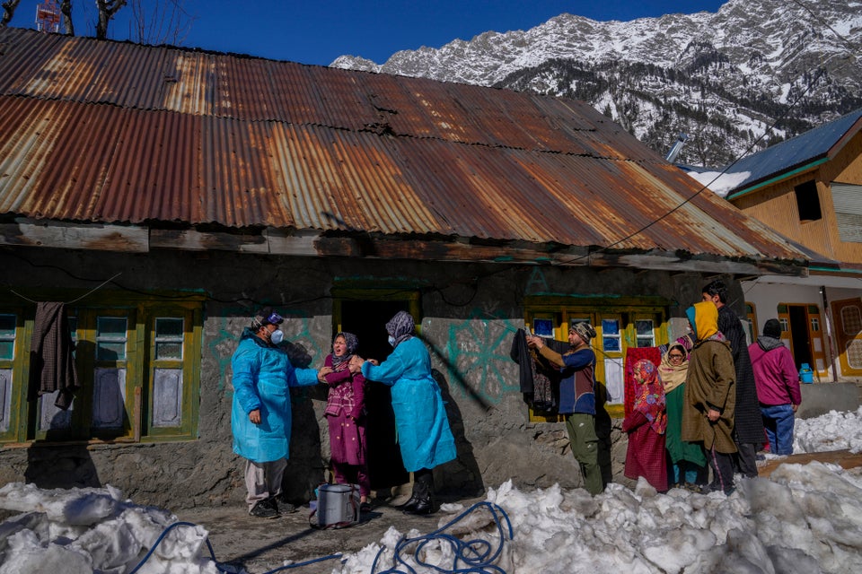 Σε ένα χωριό των Ιμαλαΐων, στο ελεγχόμενο από την Ινδία τμήμα του Κασμίρ, η νεαρή εργαζόμενη υγείας, Μασράτ Φαρίντ, ετοιμάζει την τσάντα της με τα εμβόλια ένα παγωμένο πρωινό του Ιανουαρίου, καθώς ισχυροί άνεμοι παρασύρουν το χιόνι στον αέρα.