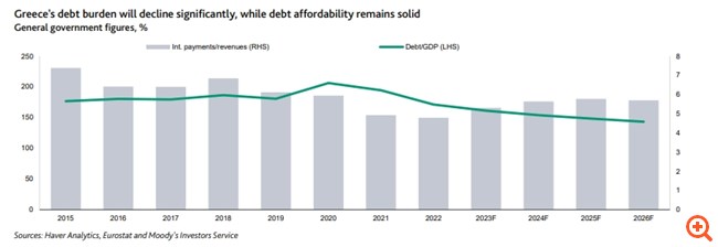 Ως αποτέλεσμα, καταλήγει η Moody's, οι πληρωμές τόκων της Ελλάδας ως ποσοστό των κρατικών εσόδων – ο προτιμώμενος δείκτης του οίκου για τη μέτρηση της προσιτότητας του βάρους του χρέους – είναι χαμηλές και θα παραμείνουν έτσι για μεγάλο χρονικό διάστημα, ακόμη και αν ληφθούν υπόψη ο δημοσιονομικός αντίκτυπος της πανδημίας και η επιστροφή σε τακτικές εξόδους της Ελλάδας στις αγορές. Σε μία αναλογία περίπου 5,5%-6,1%, η βιωσιμότητα του χρέους της Ελλάδας θα παραμείνει ισχυρότερη από αυτήν της Ιταλίας και σημαντικά χαμηλότερη από άλλες χώρες με αξιολόγηση Ba3, όπως τονίζει.